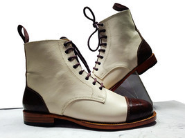 New Handmade Men's Ankle High Boot,Men's White Burgundy Tone Leather Cap Toe Bo