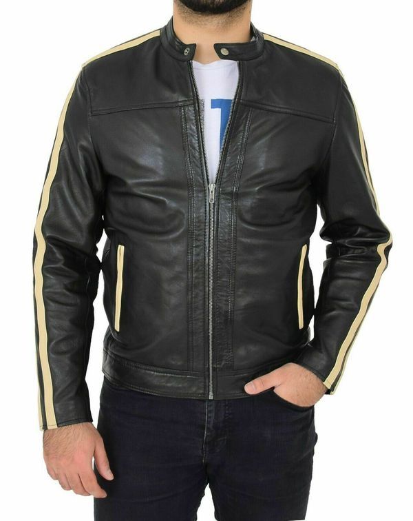 Classic men's sheepskin 100% leather jacket biker motorcycle slim fit black