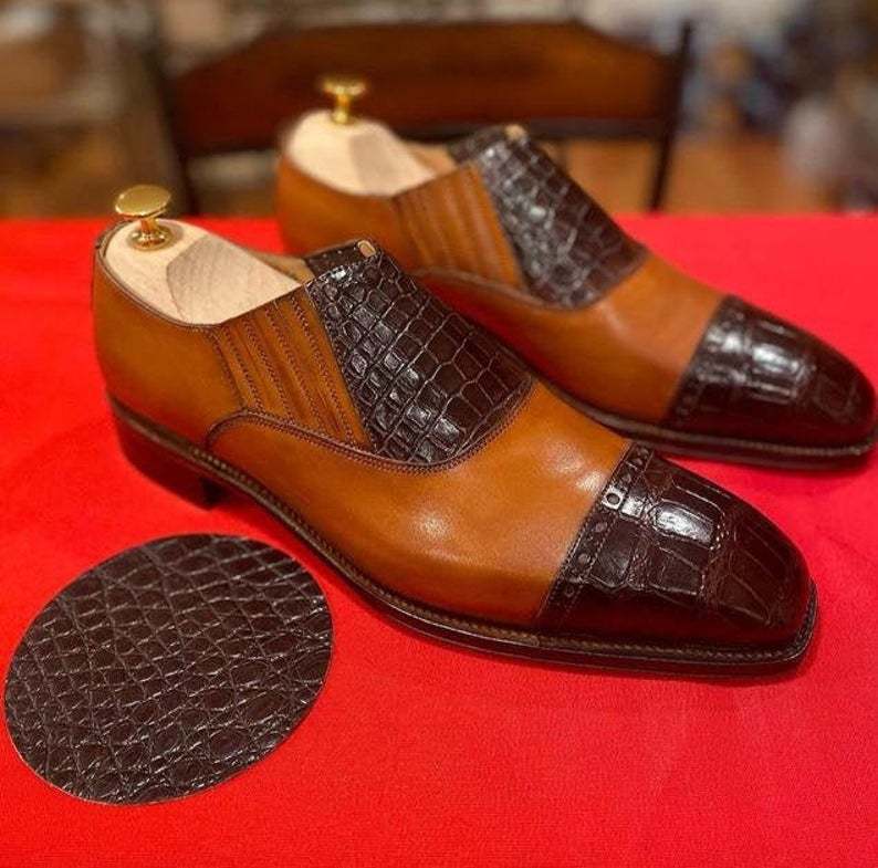 New Handmade Pure Tan Cow & Dark Brown Crocodile Leather Stylish Shoes for Men's